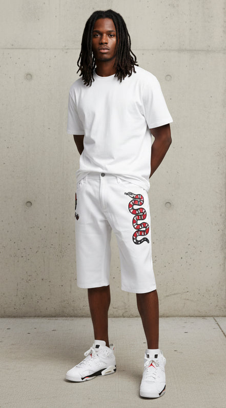 *MAXI MILIAN* (WHITE) ~SNAKES~ DENIM SHORTS (SLIM FIT) (EMBROIDERED)