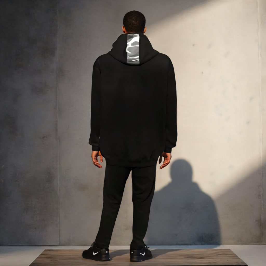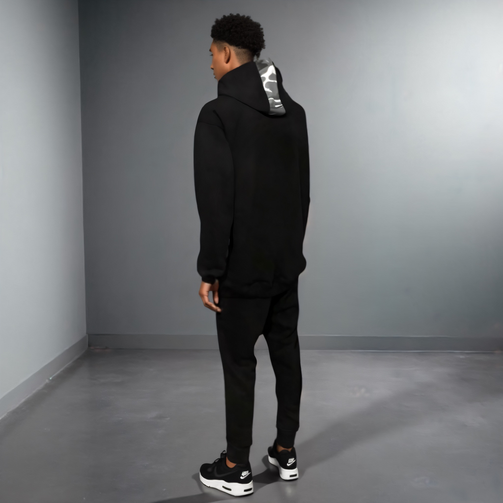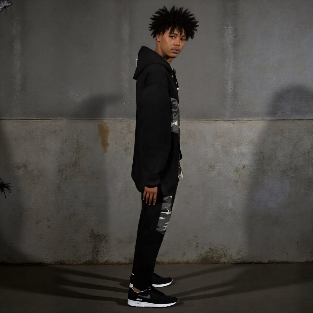 Elevate your athleisure style with the 23 GOAT Luxury Hooded Zip Up Sweatsuit in grey camo. Crafted with a combination of premium 90% cotton and 10% polyester, this sweat suit features detailed cut-and-sew details and embroidered logos for an understated yet luxurious finish. The full zip hoodie and back zip jogger pocket complete the look with a touch of elegance. Request measurements to find the perfect fit.