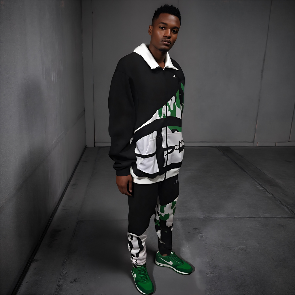 100% Polyester camouflage pattern and 90% Cotton/10% Polyester black panels grace this full zip tracksuit with a collar. Crafted with quality in mind, it features front pockets, joggers and a jacket. Made in a very limited run of only 6 pieces, this exclusive, BIG CHIEF APPAREL/OUTFIT KINGS product is sure to meet your expectations - measurements available upon request. Shop with confidence!